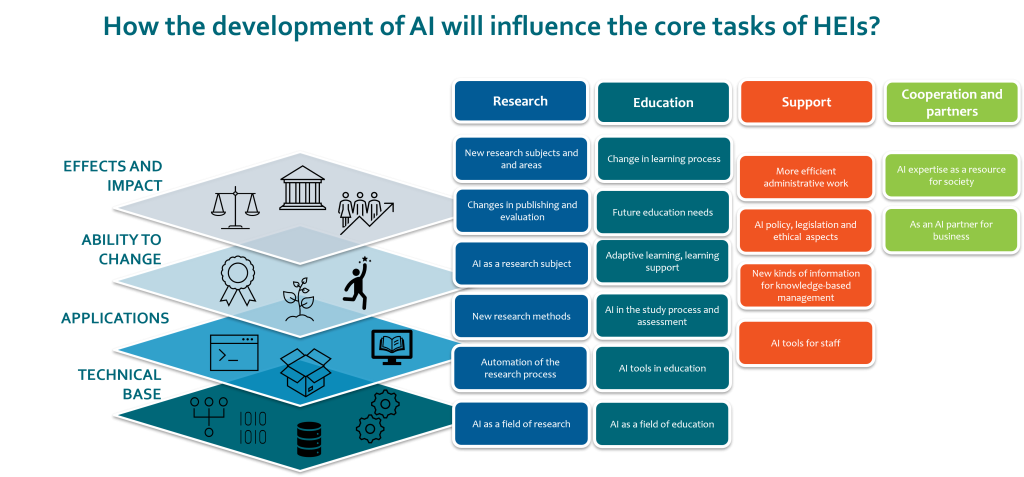 AI development impacts all core functions of higher education: it changes how research is conducted, how teaching is delivered, and how RDI processes are managed. This change is already visible in day-to-day operations and strategic planning in higher education. But how can we make sense of such a complex phenomenon?